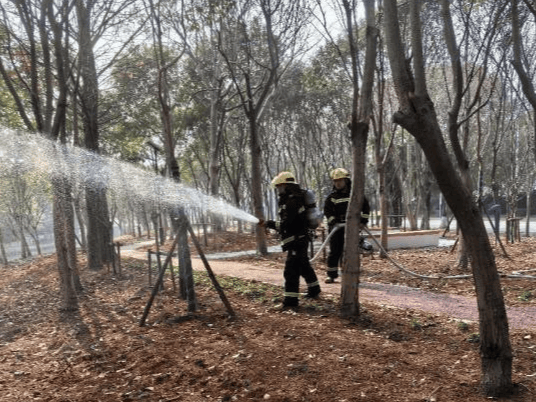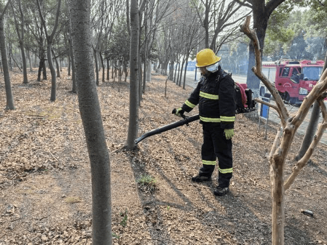 镇绿化市容所接到拉动信息后,迅速联动陈春路微型消防站,启动应急响应,仅用6分钟便赶到指定现场,分工协作实施演练。陈春路微型消防站充分发挥专业优势,通过消防车对林地实施喷水灭火作业,快速压制火情蔓延;林地养护单位携带手抬泵、风力灭火器等应急装备,熟练操作手抬泵同步开展喷水灭火,形成协同作战、立体处置的良好格局,顺利完成此次任务。